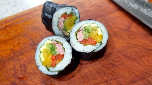 건강하고 맛있는 김밥을 즐기기 위해서는 햄이나 맛살 대신 달걀, 두부, 닭가슴살을 넣어 단백질을 보충하고, 짠맛이 덜한 재료를 사용하는 것이 좋다. 시금치, 당근 외에 파프리카, 오이, 양배추, 버섯 등 다양한 채소를 넣어 식이섬유를 늘리며, 김밥과 함께 국물을 먹는다면 짠맛이 강한 라면이나 우동 대신 맑은 미소 장국이나 멸치육수 국물을 곁들이는 것이 좋다.