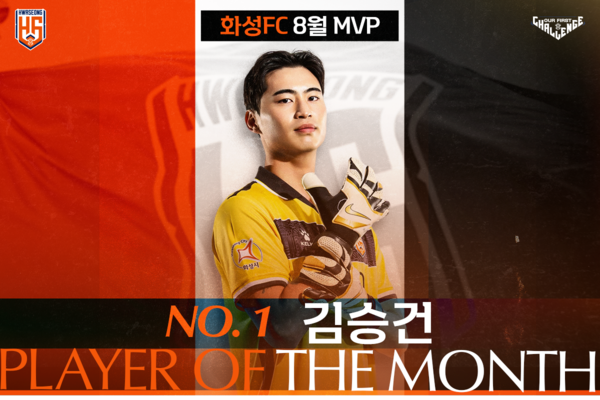 4일 화성은 보도자료를 통해 "화성FC의 든든한 수문장 김승건 선수가 팬 투표를 통해 2025시즌 8월 월간 MVP로 선정됐다"라고 밝혔다.