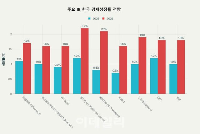 지난달 말 기준 주요 IB 8개사가 제시한 올해 우리나라 성장률 전망치의 평균과 중간값은 모두 1.0%로 전월과 같았다. 한국은행이 지난달 28일 수정 경제전망을 통해 제시한 올해 성장률 전망치인 0.9%보다 0.1%포인트 높은 수치다.