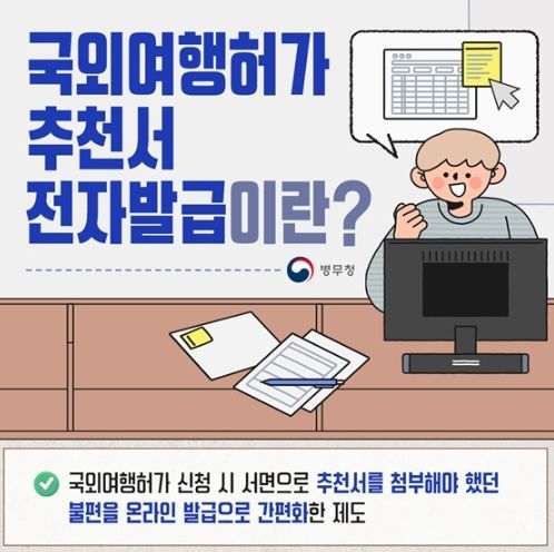 국외여행허가 신청 시 서면으로 추천서를 첨부해야 했던 불편을 온라인 발급으로 간편화한 제도.