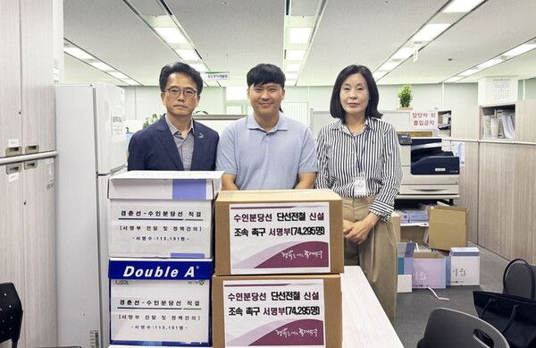 서울 동대문구(구청장 이필형)는 경기도 남양주시와 함께 4일 국토교통부에 수인분당선 청량리역과 왕십리역 간 1㎞ 단선전철 신설을 촉구하는 서명부를 제출했다고 밝혔다.