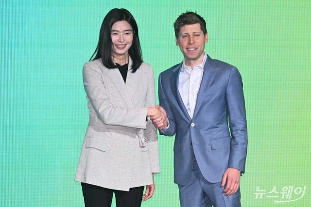 (왼쪽)정신아 카카오 대표와 방한 중인 챗GPT 개발사 오픈AI 창업자인 샘 올트먼 최고경영자가 4일 오전 서울 중구 더플라자호텔에서 열린 '오픈 AI-카카오' 기자간담회에서 악수를 하고 있다. 사진=강민석 기자 kms@newsway.co.kr