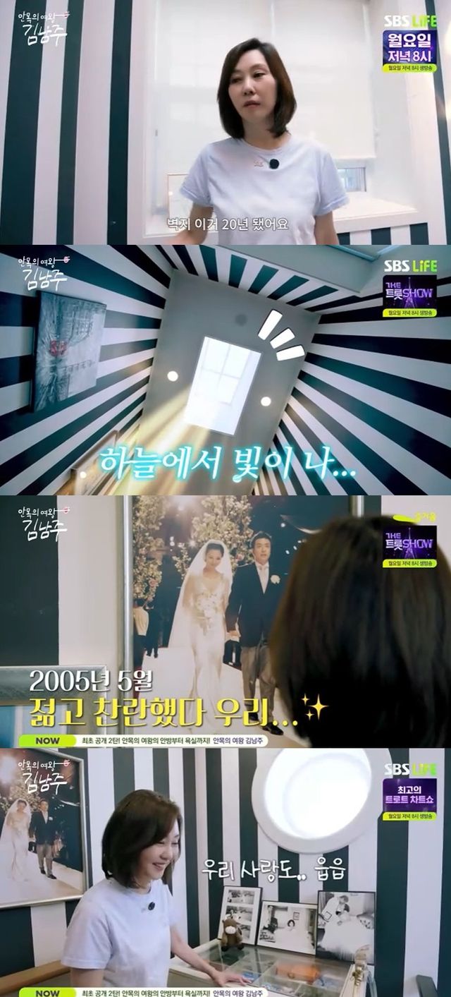 오래된 결혼 사진에 대해 "빛바랜 추억 사진이다. 흑백 사진인데 누렇게 바뀌었다. 우리 사랑도 변색됐다"고 너스레를 떤 김남주는 안방을 공개하며 "여기 20년 됐다. 남편이 아무것도 안 고쳐준다"고 고백했다.