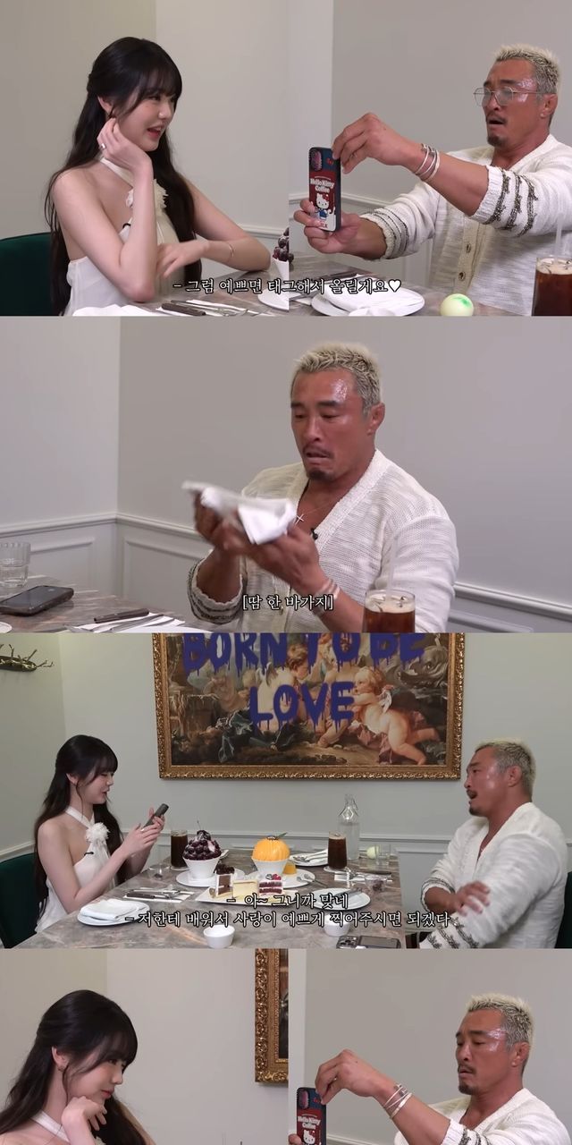 디저트와 장원영의 미모를 담기 위해 노력한 추성훈은 긴장한 상태로 사진을 찍었고, 결과물에 만족한 장원영은 "진짜 잘 찍으셨다. 너무 예쁘다"며 감탄했다.