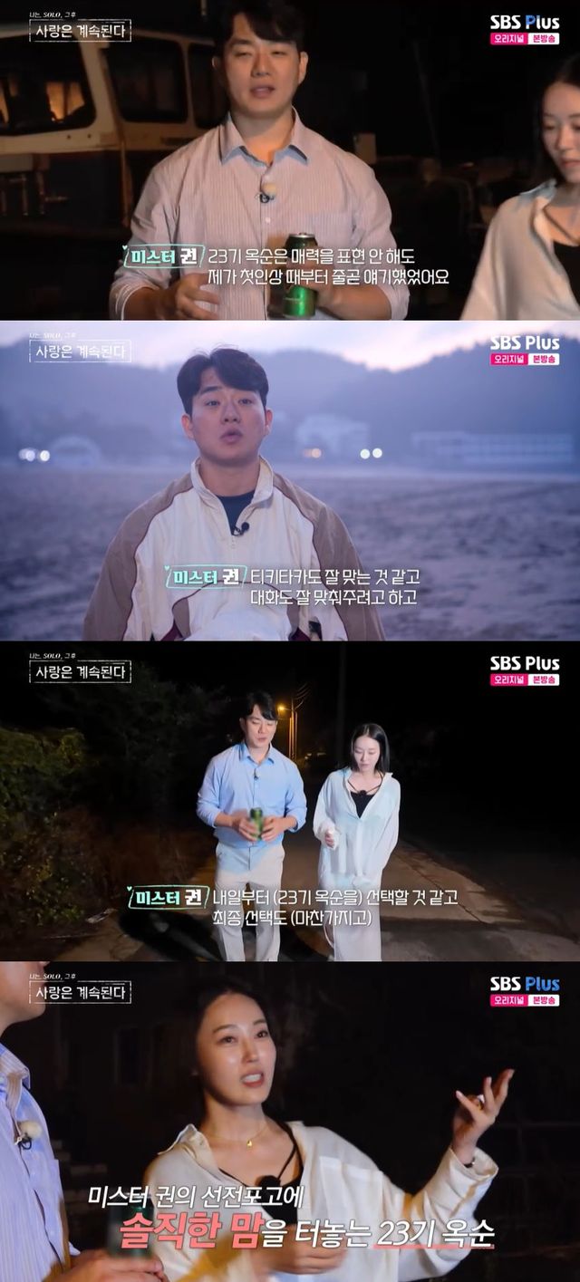 앞서 미스터 권은 인터뷰에서 "(23기 옥순이) 이상형에 가까웠다. 밝고 맑고 티키타카도 잘 맞는 것 같고 대화도 잘 맞춰주려고 하고"라며 23기 옥순에 대한 마음을 드러냈다.