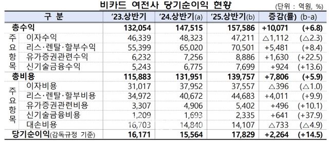반면 183개 비카드 여전사(할부·리스·신기술금융사)의 순이익은 1조7829억원으로 전년 동기 대비 14.5%(2264억원) 늘었다. 리스·렌탈·할부 수익이 5481억원 증가하고, 유가증권 관련 수익(+1630억원), 신기술금융수익(+924억원) 등이 늘어난 결과다. 비용 측면에서는 리스·렌탈·할부 부문이 4011억원 증가했으나, 대손비용(–733억원)과 이자비용(–396억원)은 줄었다.