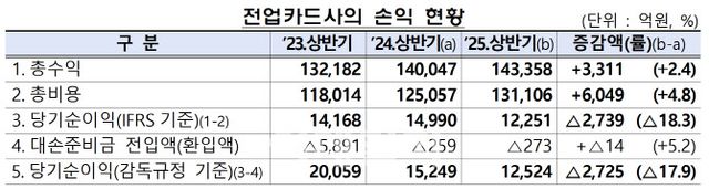 5일 금융감독원에 따르면 올해 상반기 8개 전업 카드사의 순이익은 1조2251억원으로 전년 동기(1조4990억원)보다 18.3%(2739억원) 감소했다. 카드대출과 할부수수료 수익은 늘었으나, 가맹점 수수료 수익이 2911억원 줄고 대손비용도 2643억원 증가한 영향이다. 이자비용도 1013억원 불어나며 부담을 키웠다.