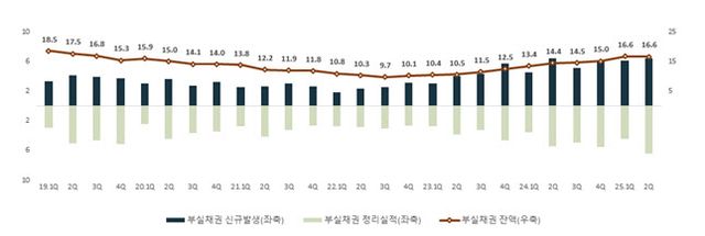 5일 금융감독원이 발표한 ‘2025년 6월말 국내은행 부실채권 현황’에 따르면 은행권 부실채권은 16조6000억원으로 전 분기말(16조6000억원)과 유사한 수준이다. 기업여신 13조1000억원, 가계여신 3조2000억원, 신용카드채권 3000억원 순이다.