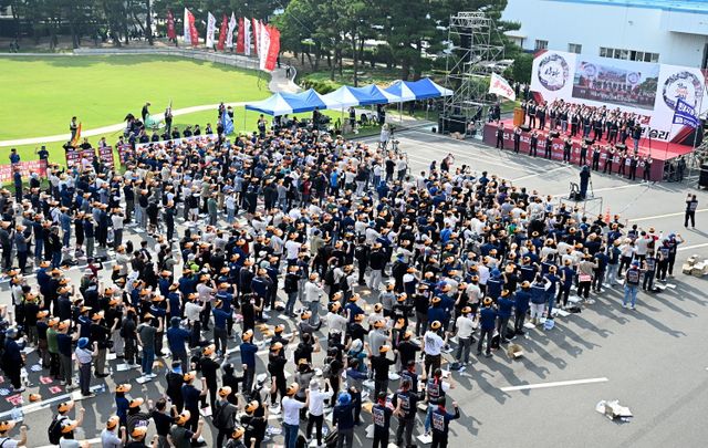 26일 오후 현대자동차 노조가 현대차 울산공장 본관 앞 광장에서 올해 임단협 승리를 위한 전체 조합원 출정식을 진행하고 있다. 2025.06.26 뉴시스