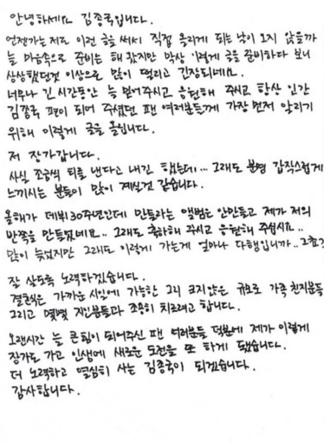 김종국이 팬 카페에 공개한 자필편지 / 김종국 SNS 캡처
