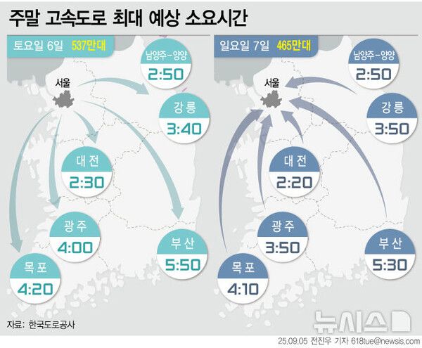 뉴시스 보도에 따르면, 5일 한국도로공사의 주말 교통량 전망에 따르면 토요일인 6일 전국 교통량은 537만대, 일요일인 7일은 465만대로 1주 전보다 각각 20만대, 17만대 줄어드는 것으로 나타났다. 토요일 수도권을 빠져나가는 차량은 44만대, 일요일에 수도권으로 들어오는 차량은 43만대 수준이다.