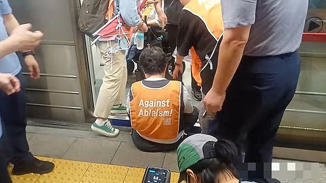 이날 코레일 등에 따르면 오전 7시51분쯤 경기 과천시 선바위역에 정차한 상행 열차에 전장연 활동가 20여명이 무더기로 탑승해 스크린도어를 막고 열차 출발을 지연시켰다. 이로 인해 사당 방면 상행 열차는 최대 40분 가까이 지연 운행됐다.
