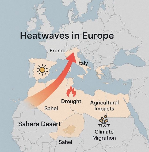 그 배후에는 사하라 사막에서 시작된 뜨거운 공기의 북상이 자리 잡고 있으며, 아프리카의 사막화와 가뭄이 유럽 폭염을 키우는 결정적 요인으로 작용하고 있다는 것이다.