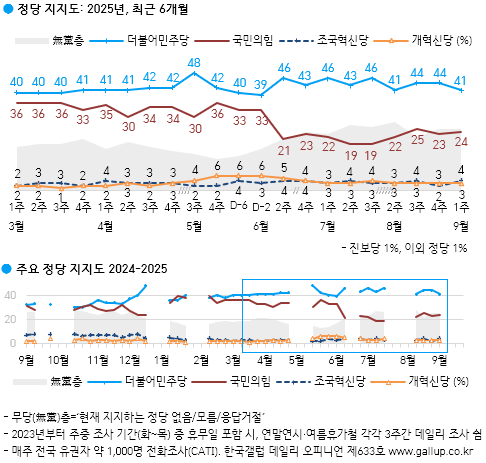 한국갤럽이 지난 2~4일 전국 만 18세 이상 남녀 1002명을 대상으로 정당 지지율 조사를 실시한 결과(오차범위 95% 신뢰수준에 ±3.1% 포인트) 민주당 41%, 국민의힘 24%, 조국혁신당 4%, 개혁신당 3%, 진보당 1% 등으로 나타났다.