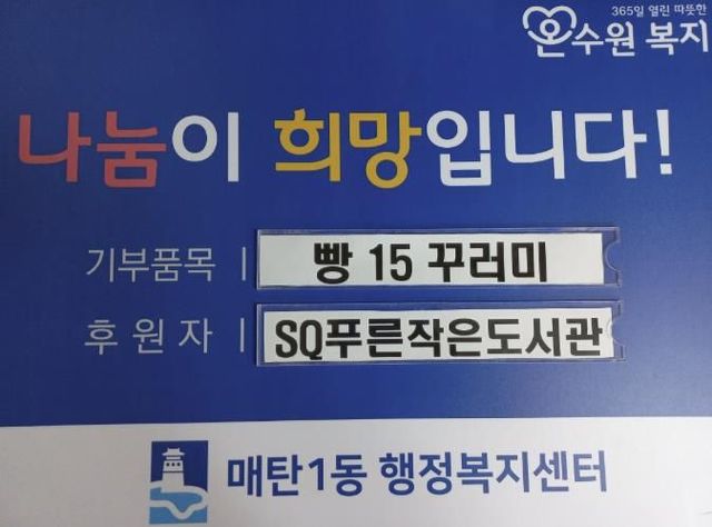 [와이뉴스] 수원특례시 영통구 매탄1동 'SQ푸른 작은도서관'은 지난 4일, 저소득 가정을 위한 빵 꾸러미를 매주 정기적으로 후원하고 있다고 밝혔다.