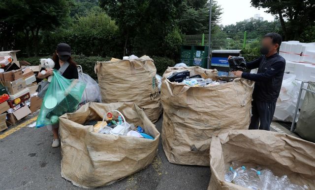 한 아파트 단지 내 분리수거장에서 시민이 재활용 쓰레기를 분리배출하고 있다. / 뉴스1