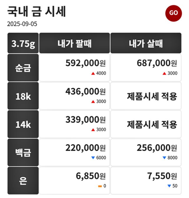 순금(24K) : 매입가 68만 7000원 / 매도가 59만 2000원