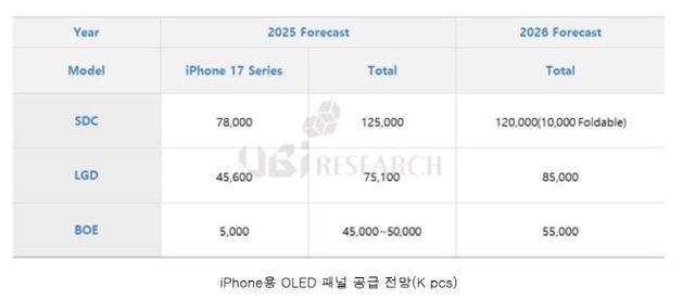 중국 BOE의 경우 지난해 아이폰 16 일반 모델 패널 공급에는 성공했으나 초기 공급에서 차질을 빚어 총 출하량이 660만대에 그쳤다. 전체 출하량은 4300만 대였으며, 올해는 아이폰 17 프로용 약 500만대를 포함해 4500만~5000만대 수준이 예상된다.