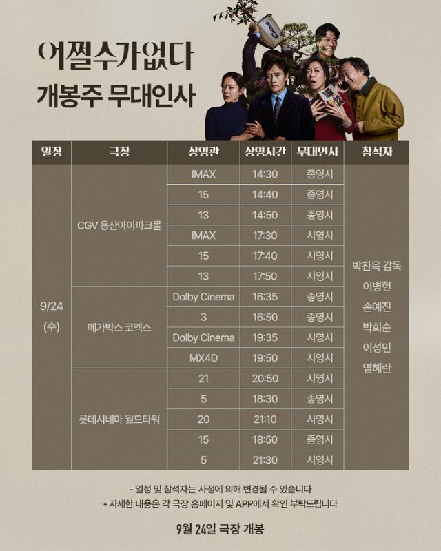 먼저 개봉일에는 박찬욱 감독을 비롯해 이병헌, 손예진, 박희순, 이성민, 염혜란이 CGV 용산아이파크몰, 메가박스 코엑스, 롯데시네마 월드타워에서 개봉 첫날부터 열띤 관심을 보내준 관객들과 뜻깊은 시간을 보낼 예정이다. ‘어쩔수가없다’의 주역들은 개봉 첫 주말에도 관객들과 뜨거운 소통을 이어간다. 27일에는 이병헌, 손예진, 박희순, 이성민, 염혜란이 롯데시네마 김포공항, 메가박스 목동, CGV 영등포, 롯데시네마 영등포, CGV 용산아이파크몰을 찾아 풍성한 팬 서비스로 극장가에 활력을 불어넣을 것이다. 이어서 28일에는 CGV 용산아이파크몰, CGV 왕십리, 롯데시네마 월드타워, 메가박스 코엑스, CGV 압구정을 찾아 관객들에게 감사 인사를 전할 예정이다. 이처럼 개봉일과 개봉 첫 주말 무대인사를 확정한 ‘어쩔수가없다’는 흡인력 있는 전개와 다채로운 캐릭터의 향연으로 올가을 극장가를 매료할 것이다.
