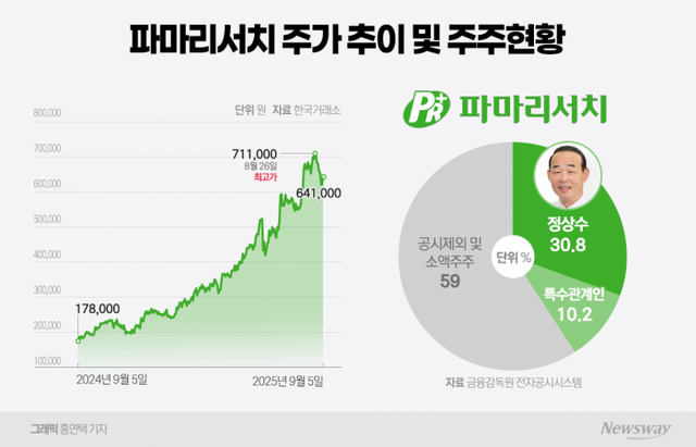 파마리서치 반기보고서에 따르면 정 회장의 파마리서치 지분은 30.8%(356만1663주)로 연초 대비 지분가치는 약 1조 3200억원 증가했다.