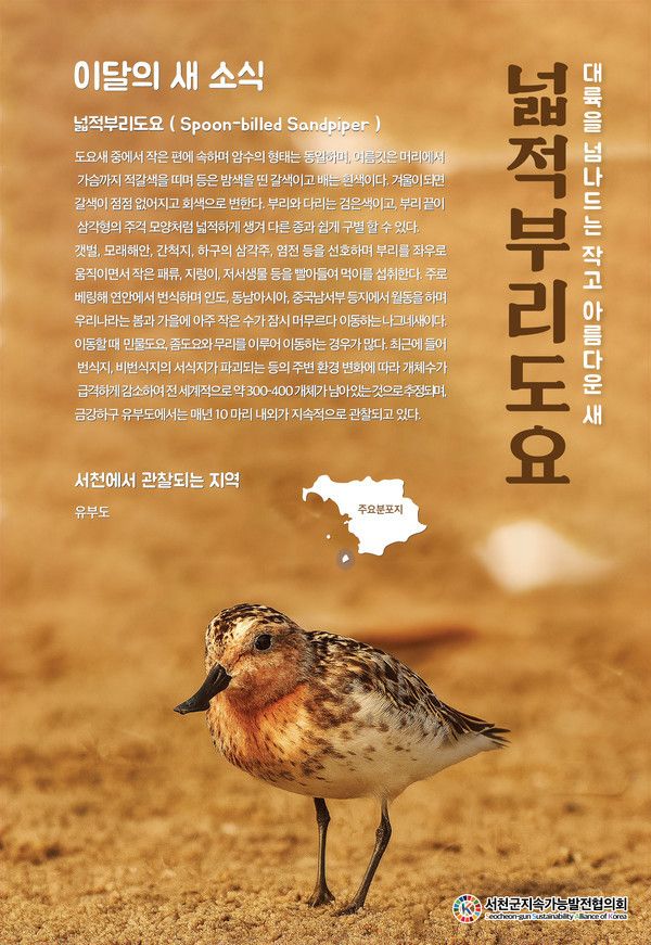 서천군지속가능발전협의회가 9월 '이달의 새'로 세계적 멸종위기종인 넓적부리도요를 선정한 가운데, 이 새가 국내에서 유독 발견되는 지역이 있어 화제다.