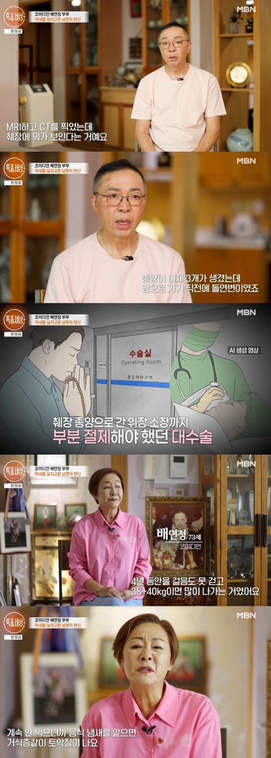 그는 "MRI하고 CT를 찍었는데 췌장에 뭐가 보인다고 했다. 종양이 3개가 생겼는데, 암으로 가기 직전 돌연변이였다"라며 안 좋았던 배연정의 건강 상태를 설명했다.