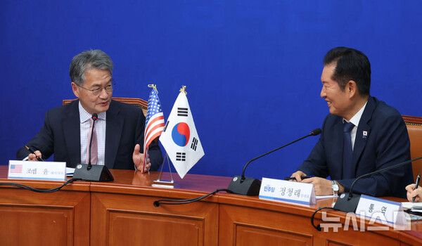 정청래 더불어민주당 대표는 5일 국회에서 조셉 윤 주한 미국대사대리를 만나 "이재명 대통령과 도널드 트럼프 대통령 재임 시절에 한미 관계가 더욱 발전하길 기대한다"고 했다.