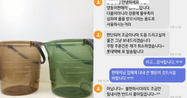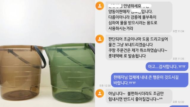 판매자는 스스로 양동이 판매자라고 밝히며 “강릉에 물 부족이 심해 물을 받으시려는 용도로 사용하시는 것 같아 조금이나마 도움을 드리고 싶다”며 “물건은 그냥 보내드리겠다. 주문 건은 제가 취소했다”고 전했다. 글쓴이가 감사 인사를 건네자 “불편하시더라도 조금만 힘내면 반드시 좋아질 것”이라며 오히려 응원의 말을 남겼다.