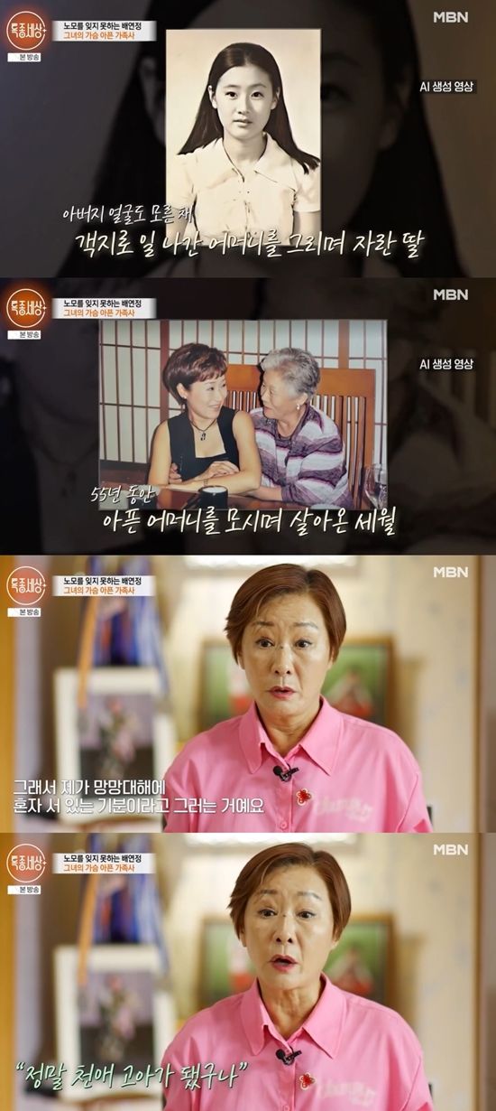 돌아가신 배연정의 모친은 모진 시집살이에 배연정을 임신한 채 친정으로 도망 왔다고. 배연정은 아버지의 존재를 모른 채 타지에서 일하는 어머니를 늘 그리워하며 자랐다. 그래서 그는 19살 돈을 벌기 시작하자마자 어머니와 살기 시작해 55년간 함께했다.