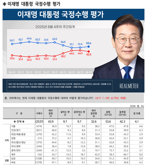 리얼미터가 에너지경제신문 의뢰로 지난달 25~28일 전국 만 18세 이상 2537명을 대상으로 실시한 조사에서는 이 대통령의 직무 긍정 평가가 53.6%로 직전 조사(8월18~22일)보다 2.2%p 올랐다.