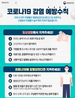 임승관 질병관리청장은 “코로나19 확산세가 아직까지 지속되고 있다”며 “고령층의 어르신이나 면역저하자 등 고위험군은 사람이 많이 모이는 실내 행사 참여를 자제해 주시고, 참여 시에는 마스크를 착용하여 코로나19를 예방하시길 바란다”고 당부했다.