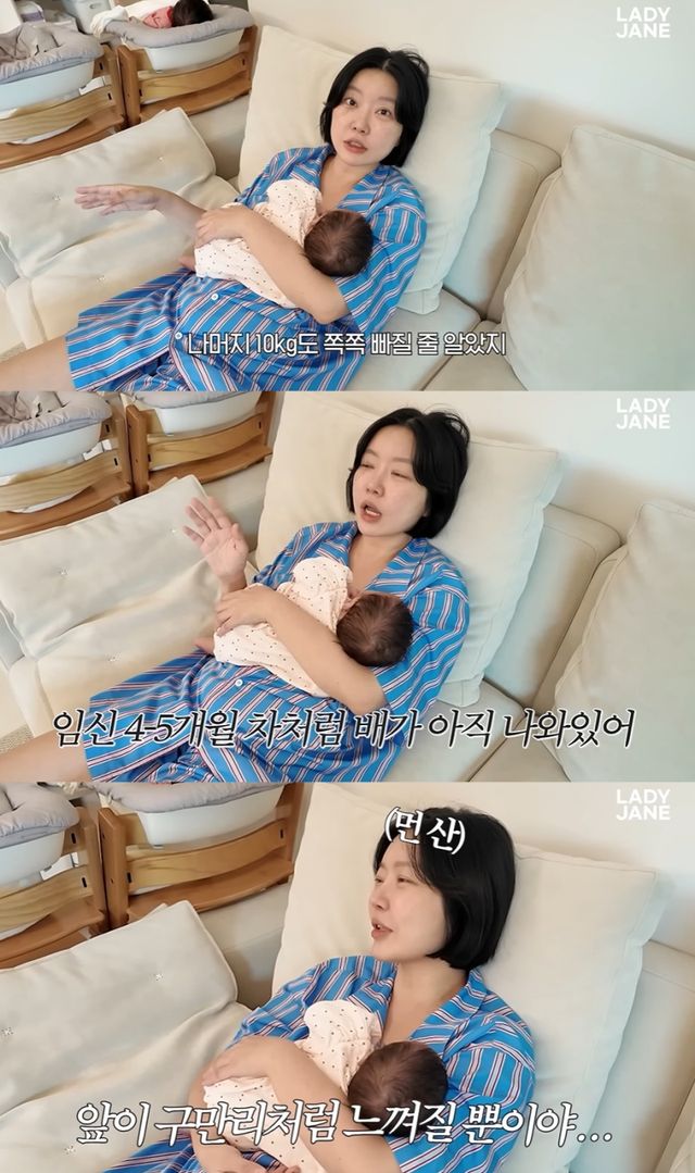 출산 후 몸매 변화에 대한 고민도 솔직하게 밝혔다. 레이디제인은 “조리원에서 10kg이 빠졌길래 나머지도 금방 빠질 줄 알았다. 그런데 하나도 줄지 않고 여전히 임신 4~5개월 배처럼 나와 있다”며 “하루 종일 집에서 아이 돌보느라 움직이지만, 이건 노동이지 운동이 아니다”라고 허탈해했다.
