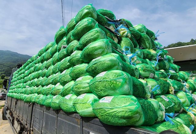 출하가 한창인 고랭지 배추 모습. 기사 이해를 돕기 위한 자료 사진. 한국인이 좋아해 즐겨 먹는 대표적인 국민 식재료인 고랭지 배추 가격 상승세가 계속되고 있다. / 연합뉴스