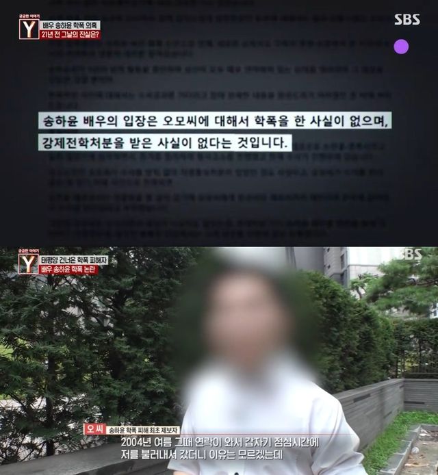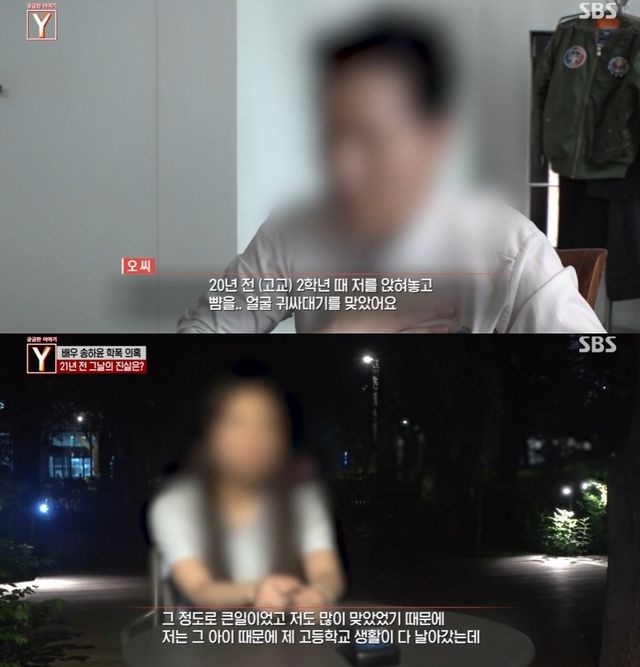 '궁금한 이야기 Y' 제작진을 만난 최초 제보자 오모 씨는 "20년 전 고교 2학년 때 저를 앉혀놓고 뺨을, 얼굴 귀싸대기를 맞았다"고 주장했다. 이어 "악마죠. 1년 전에 글을 올리고 언론사 제보까지 가게 된 이유는 1년 뒤에 허위사실로 명예훼손을 한 거잖아요"라며 송하윤 측의 고소를 언급했다.