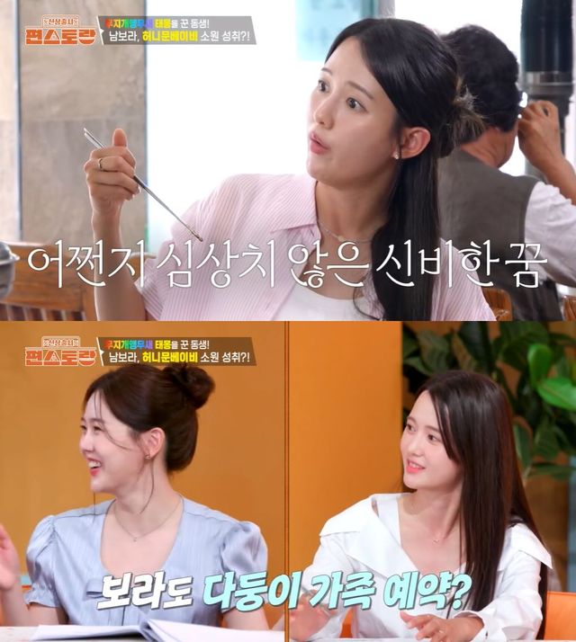 이어 남보라의 동생은 "신혼여행에서 허니문 베이비 그런거는 (없냐)"라며 "내가 최근데 태몽을 꾼 것 같아"라고 말해 눈길을 끌었다.