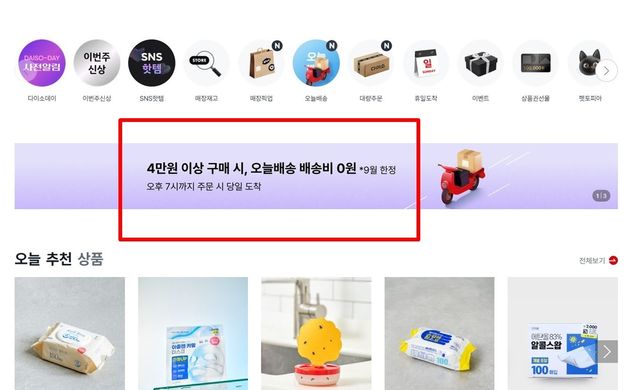 다시 말해 다이소에서 9월 중에 4만 원 이상 상품 구매하면 5000원짜리 '오늘 배송' 서비스를 무료로 이용할 수 있는 것이다.