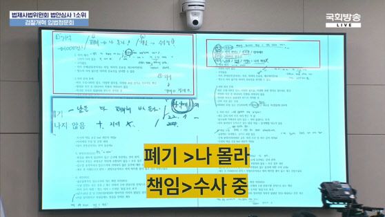 6일 정치권에 따르면 서영교 더불어민주당 의원은 전날 열린 국회 법제사법위원회 법안심사1소위원회의 검찰개혁 입법청문회에서 청문회에 증인으로 출석한 김정민 검찰수사관이 쓴 ‘남들 다 폐기해, XX들아’라고 적힌 메모를 공개했다.
