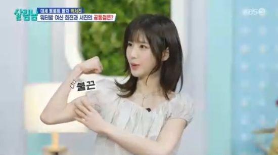희진은 "근육이 되게 많은 체질이다"라고 말하더니 즉석에서 팔 근육을 보여줬다.