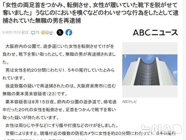 뉴시스 보도에 따르면, 4일 간사이TV 등 일본 언론에 따르면 오사카 경찰은 외설 및 강도 상해 혐의로 센난시에 사는 23세 남성 A 씨를 체포했다.