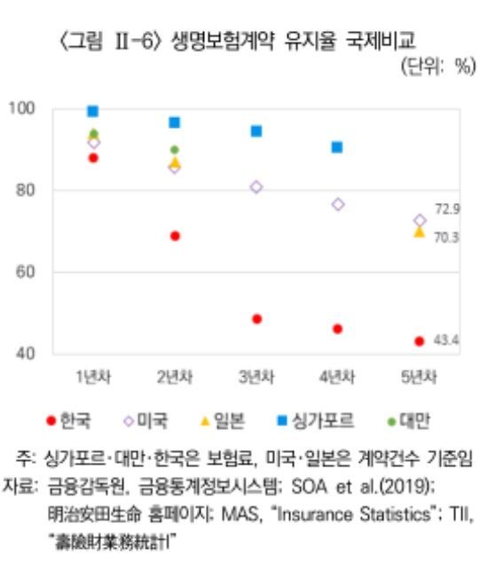 뉴시스 보도에 따르면, 7일 보험연구원이 발표한 '보험개혁회의 내용과 과제: 보험영업' 보고서에 따르면 국내 생명보험 계약의 5년차 유지율은 미국보다 29.5%p(포인트), 일본보다 26.9%p 낮은 수준이다.