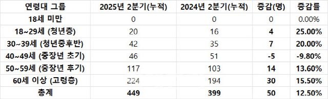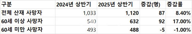 고용노동부가 내놓은 ‘2025년 2분기 산업재해 현황’(누적기준)에 따르면 올해 상반기 산업재해(사고+질병)으로 목숨을 잃은 근로자는 총 1120명, 지난해 같은기간 1033명보다 87명(8.4%) 늘었다. 이를 연령대로 구분해 보면 60세 이상 근로자중 산재 사망자수는 지난해 상반기 540명에서 올해 상반기 632명으로 92명(17%) 증가했다.