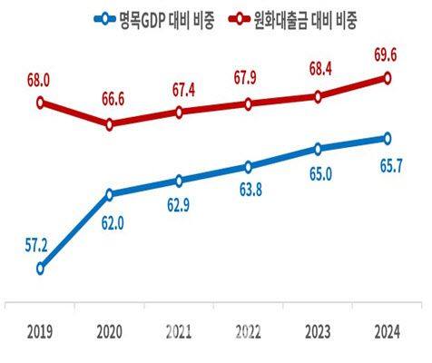 보고서는 금융권 자금이 기업금융 등 생산적 분야보다는 부동산 중심으로 과도하게 편중돼 있는 구조적 문제를 지적했다. 원화대출금 대비 부동산 대출 비중은 2020년 66.6%에서 2024년 69.6%로 상승했으며, 명목 국내총생산(GDP) 대비 비중도 같은 기간 62%에서 65.7%로 확대됐다.