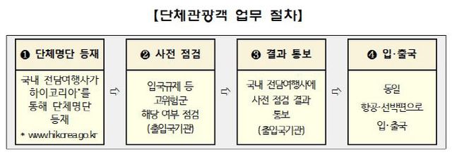 3개 관계부처는 8~19일 여행사를 대상으로 단체관광객 명단 등재 등 관련 절차 안내에 나선다. 법무부 출입국기관은 15일부터 전담여행사 등록·지정 절차를 진행할 예정이다. 10월 중국 국경절 연휴에는 중국 단체관광객의 원활한 입국을 돕기 위해 시행일 이전인 22일부터 명단 등재를 할 수 있도록 할 계획이다.