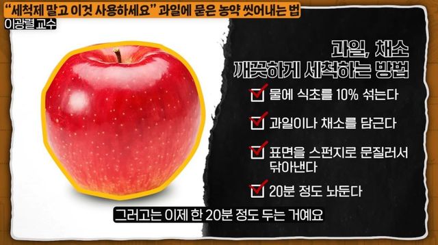 올바른 과일 세척법은 다음과 같다. 마트에서 파는 식초를 그대로 사용해 사과 같은 과일을 담가놓은 후 고무장갑을 끼고 표면을 스펀지로 세게 문질러 닦아낸다. 그 후 20분 정도 둔다. 이 교수는 "과일 세척제라고 팔고 있지만 식초나 베이킹소다를 사용하는 것이 더 효과적"이라고 말했다.