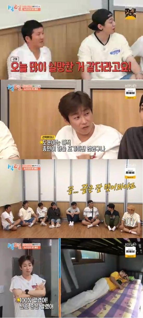 나머지 멤버들도 오른쪽 4인실로 몰리면서 왼쪽 4인실의 김종민과 유선호 2인실의 이준만 실내취침을 하게 됐다.