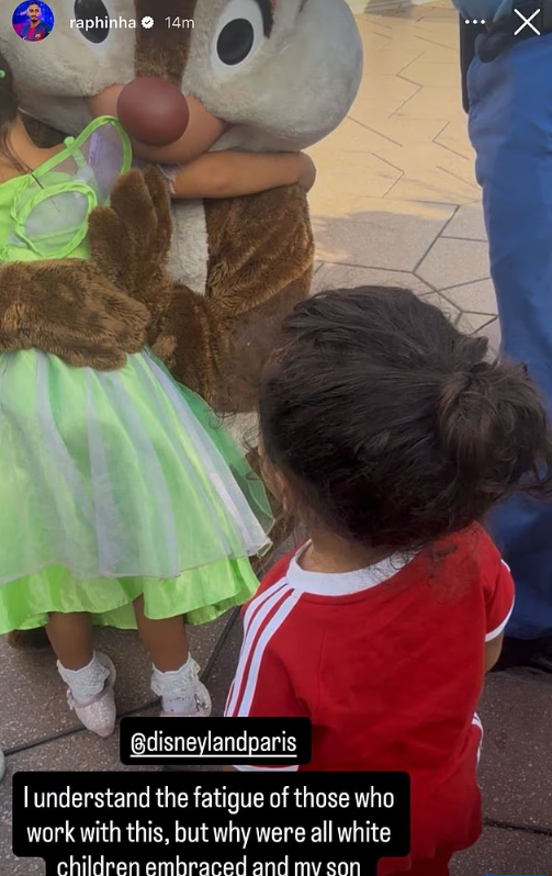 영국 일간지 '데일리 메일'은 7일(한국시간) "바르셀로나의 공격수 하피냐는 마스코트가 다른 아이들을 껴안는 동안 자신의 아이를 무시했다며 파리 디즈니랜드를 인종차별 혐의로 고발했다"며 하피냐가 그의 인스타그램에 올린 영상을 주목했다.