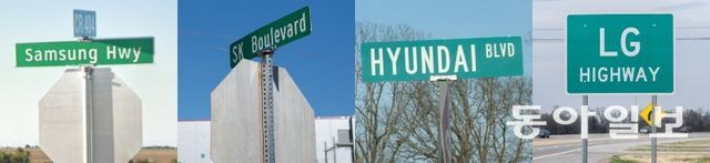 국내 4대 그룹의 이름을 딴 도로 표지판이 미국 곳곳에 설치돼 있다. 대규모 투자에 감사하다는 의미로 현지 당국이 세운 것이다. 왼쪽 사진부터 텍사스주 ‘삼성 하이웨이’, 조지아주 ‘SK 불러바드’, 앨라배마주 ‘현대 불러바드’, 테네시주 ‘LG 하이웨이’. 동아일보DB