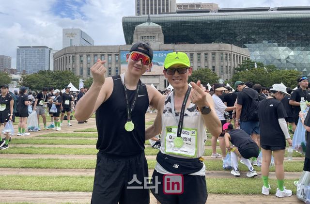 | 7일 서울 중구 서울광장에서 열린 ‘런 서울 런 2025(일간스포츠 서울마라톤)’에 함께 참가한 아들 이호근 씨와 아버지 이정식 씨가 포즈를 취하고 있다. |