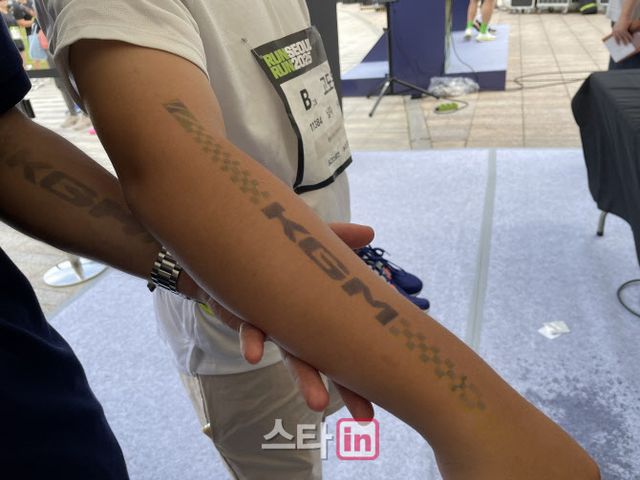 | 7일 서울 중구 서울광장에서 열린 ‘런 서울 런 2025(일간스포츠 서울마라톤)’ 행사 부스에서 한 참가자가 타투 프린팅을 받고 있다. |