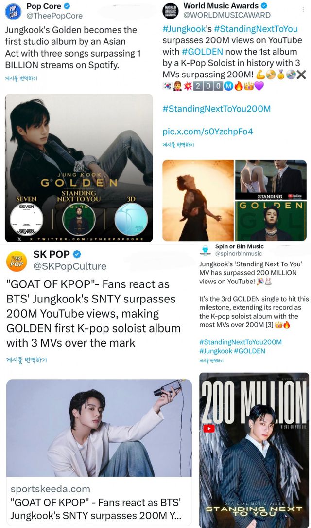 ‘유럽의 빌보드’로 불리는 ‘월드뮤직어워드’(WMA), ‘SK팝’(SKPop), ‘스핀 오알 빈 뮤직’(Spin or Bin Music) 역시 정국의 성과를 집중 조명했다. 세 곡 모두 유튜브에서 2억 뷰 이상 뮤직비디오를 달성한 K-팝 솔로 아티스트 사상 최초 사례라며 의미를 부여했다.